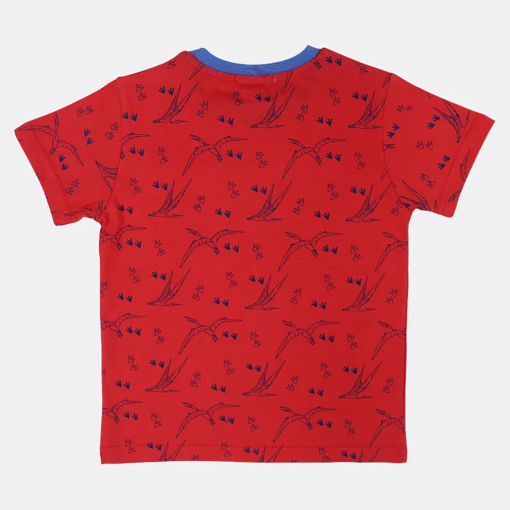 Boys Cotton T-Shirt - Red with Flying Dinos Print