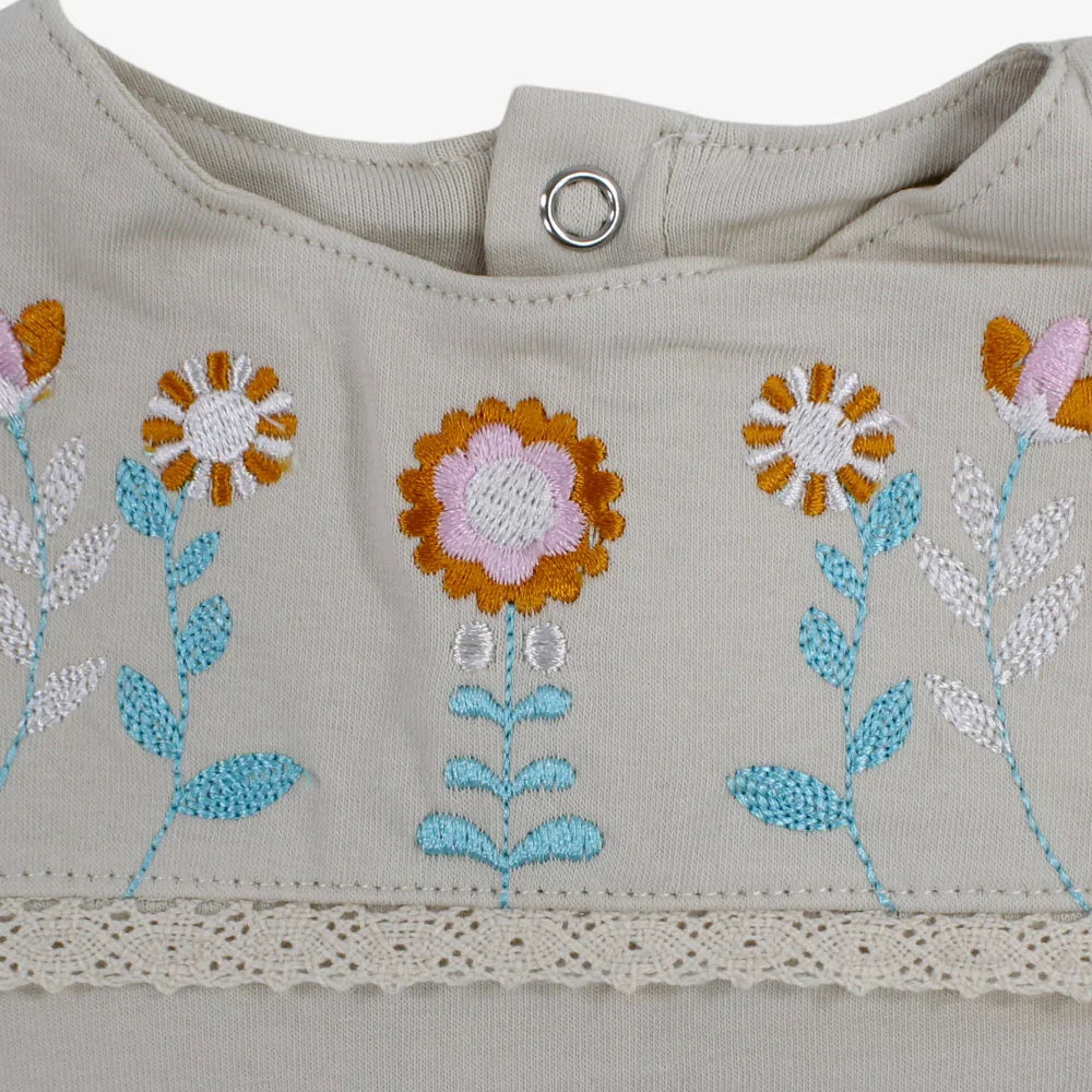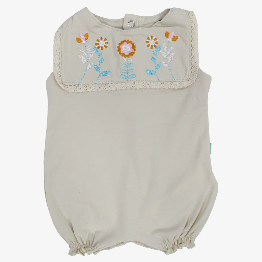 Soft, breezy, and full of charm—this beige floral romper is perfect for sunny days and sweet photo moments. With its sleeveless design and delicate flower print, it's both adorable and practical for everyday wear.