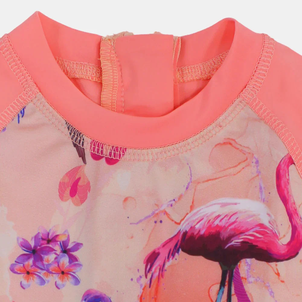 Add a splash of color to swim days with this salmon pink swimsuit overall, featuring a fun flamingo design. It’s playful, practical, and perfect for little girls who love sunny adventures.