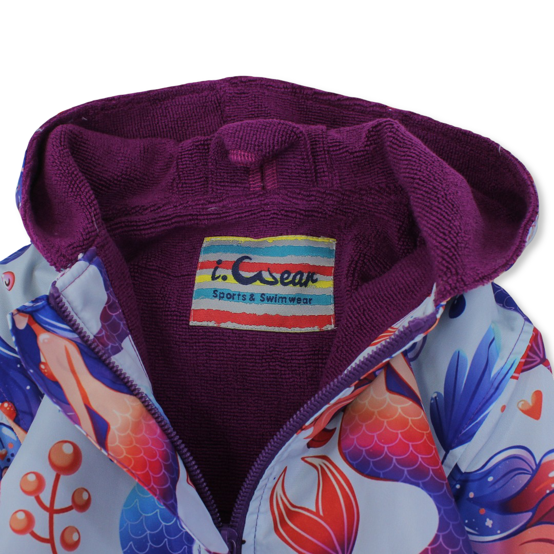 A comfy and waterproof swim robe designed to keep girls warm and dry after water play, featuring a lovely mermaid print.