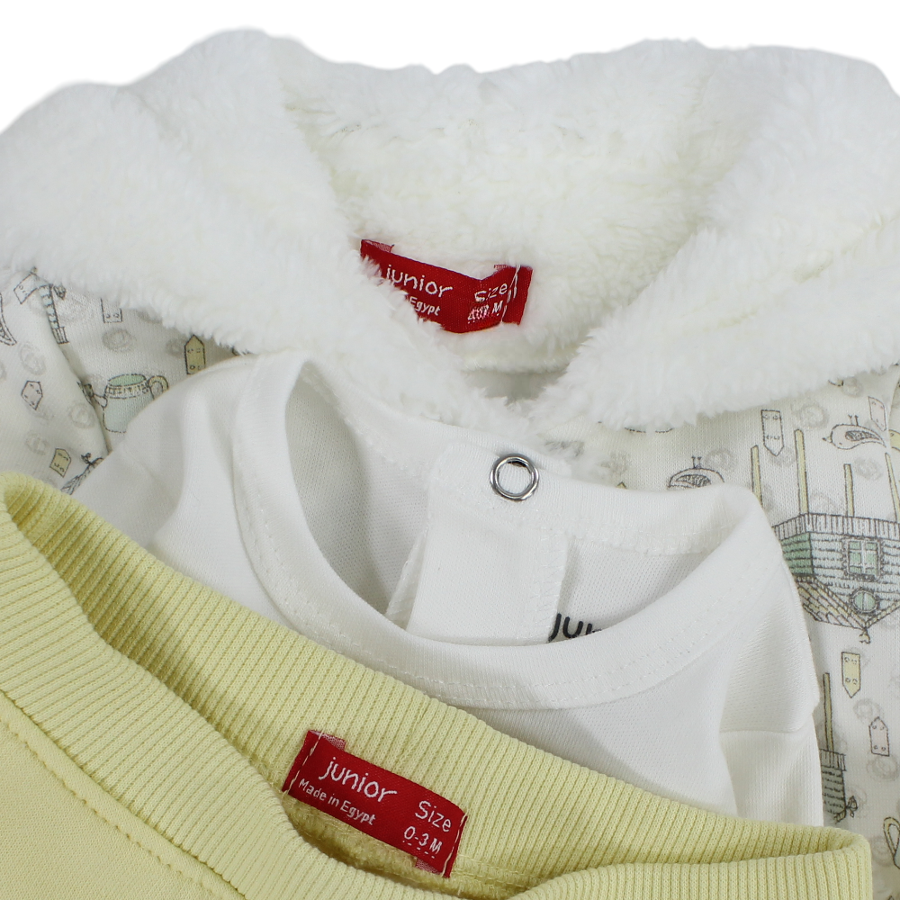 • Includes a long-sleeved “Follow Your Dreams” bodysuit, yellow footed pants, and a wrap-style hooded top with tie closure