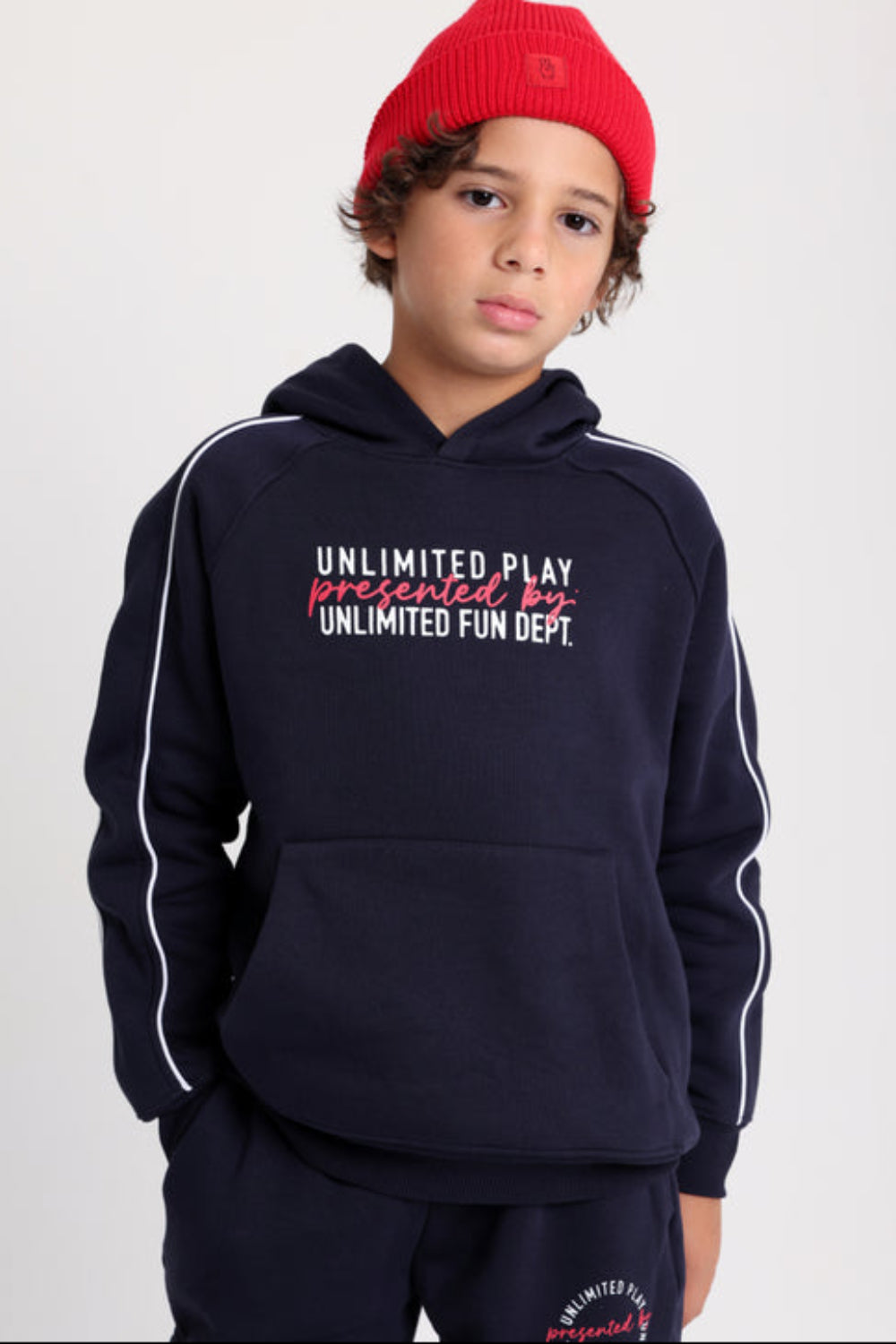 Boys Cotton Hoodie – Navy with "Unlimited Play Presented By Unlimited Fun Dept" Print