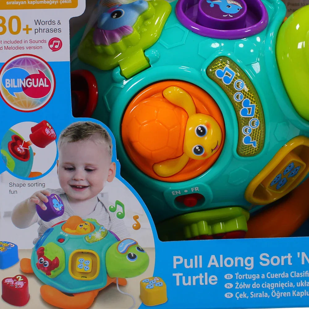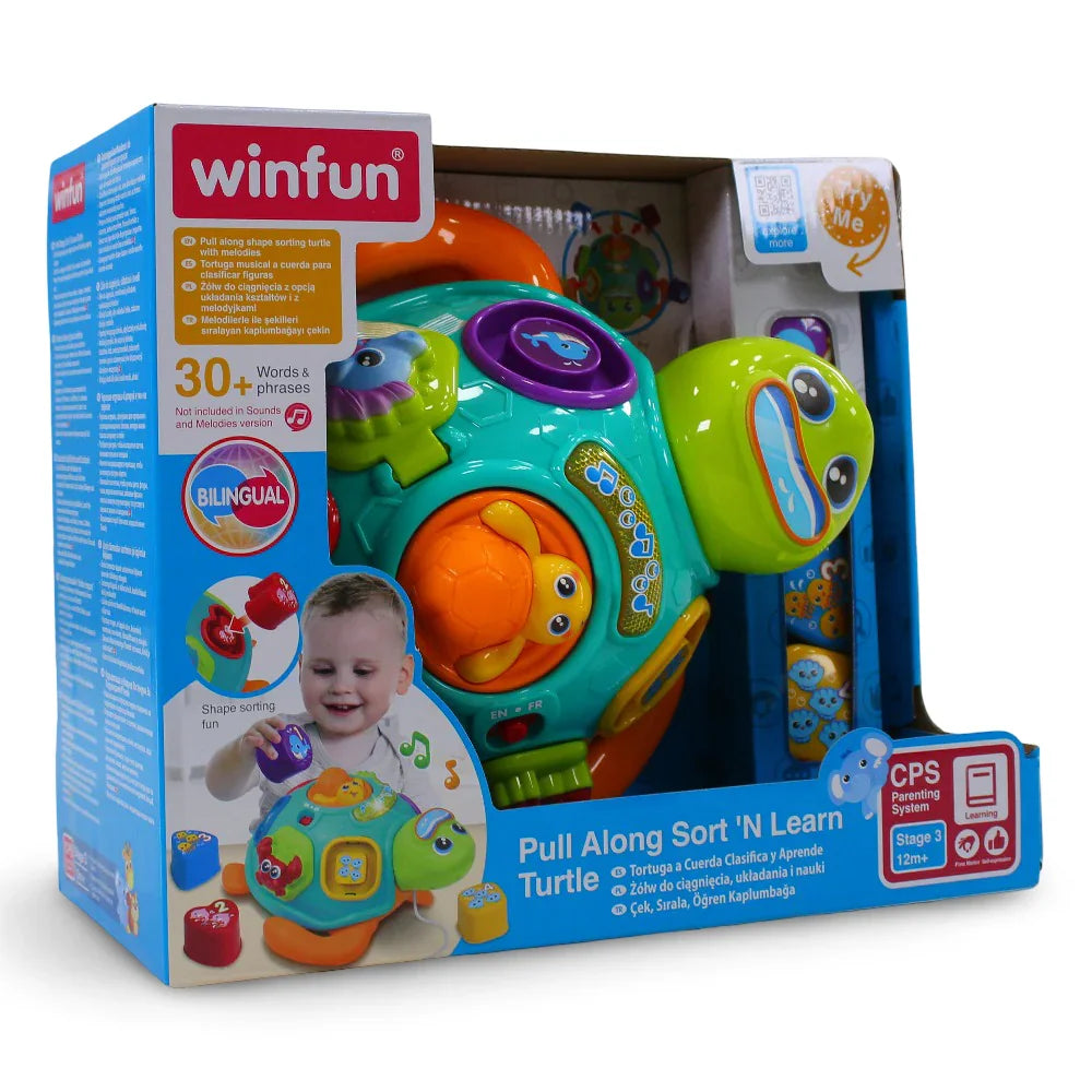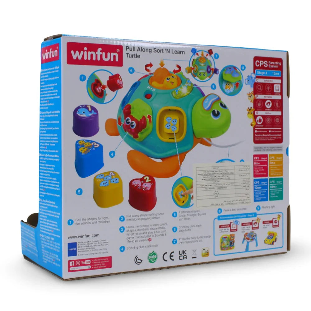 Play, learn, and explore with the WinFun Pull Along Sort 'N Learn Turtle! This adorable turtle is a pull-along toy and shape sorter in one—perfect for toddlers on the move. With colorful shape blocks, fun sounds, and a wiggly head that moves as it rolls, it encourages shape recognition, motor skills, and early walking confidence.