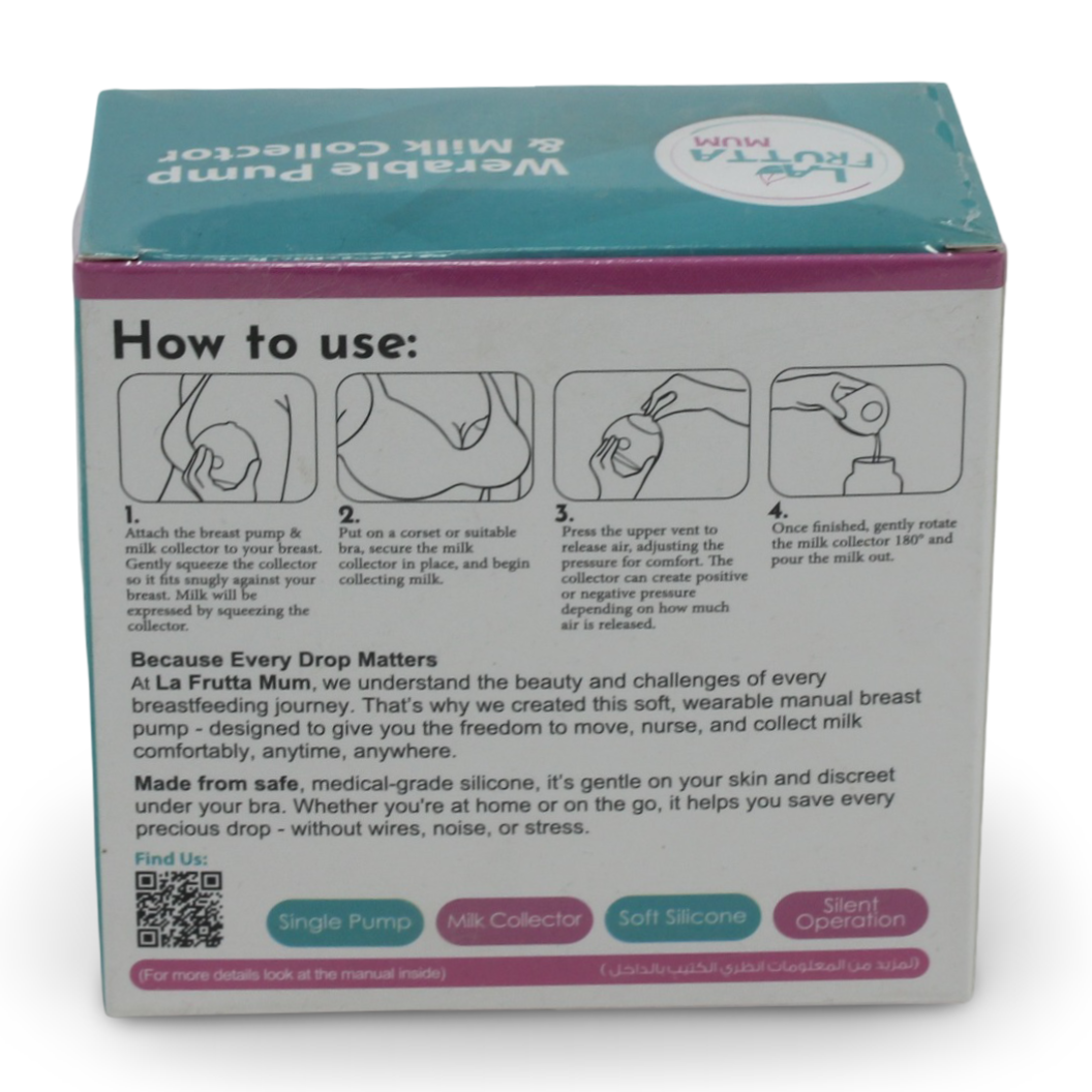 A practical milk collection pump from La Frutta designed to help breastfeeding moms collect leaking milk comfortably and efficiently.