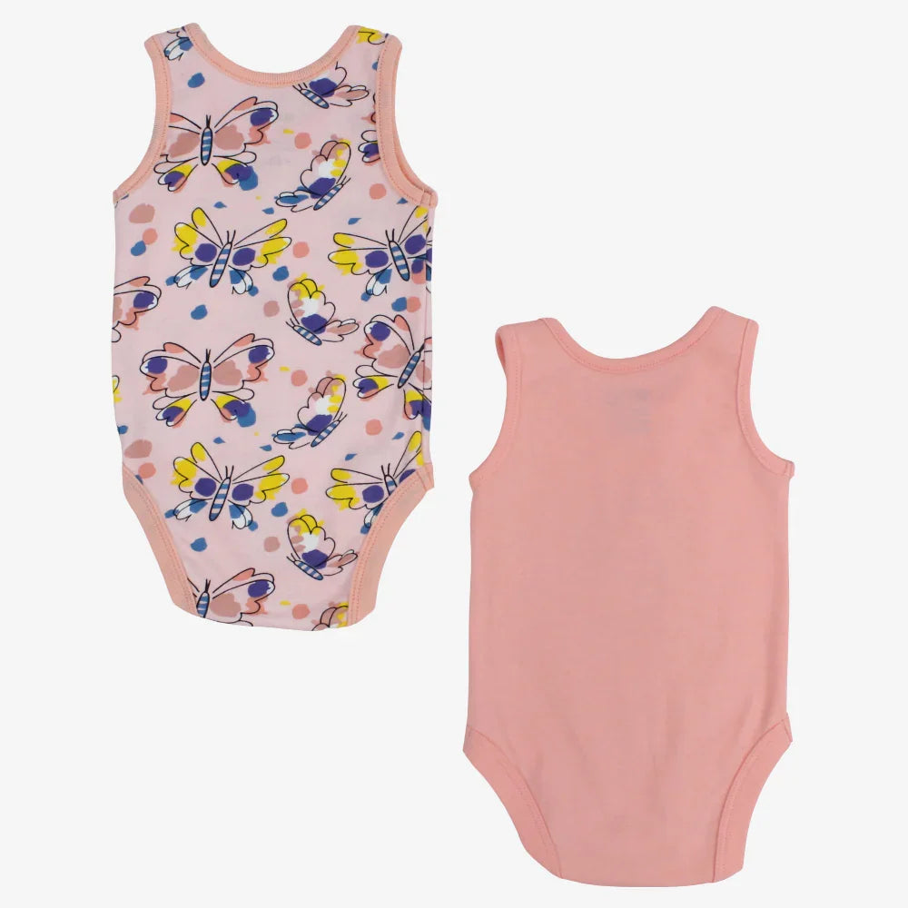 Soft, sweet, and perfect for sunny days! This 2-pack of sleeveless cotton bodysuits features adorable butterfly designs in cheerful pink and salmon tones—just right for warm-weather comfort and style.