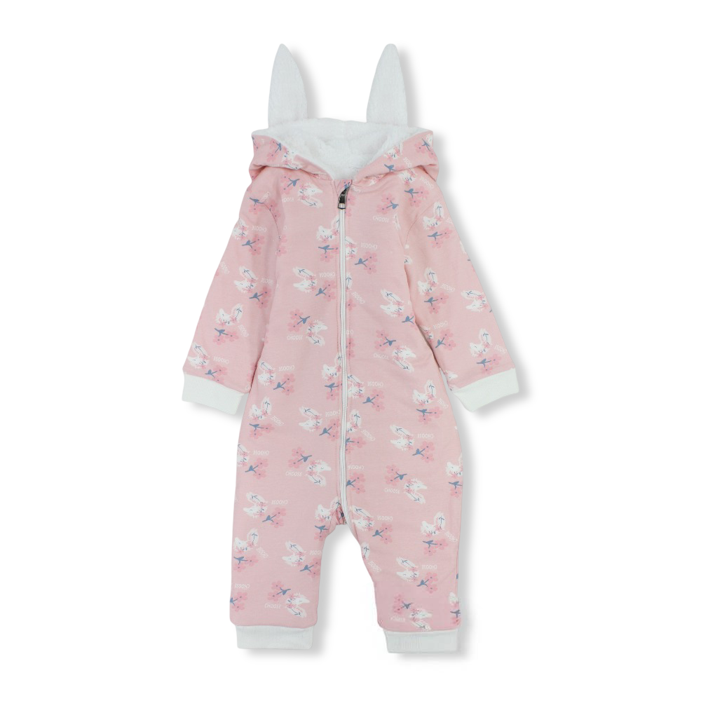 Baby Girls Fleeced Hooded Footless Onesie – Pink with Flowers & Sleepy Horses Print