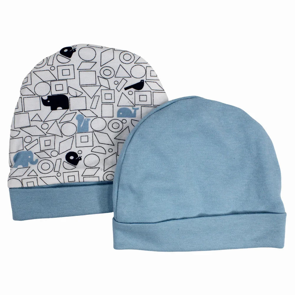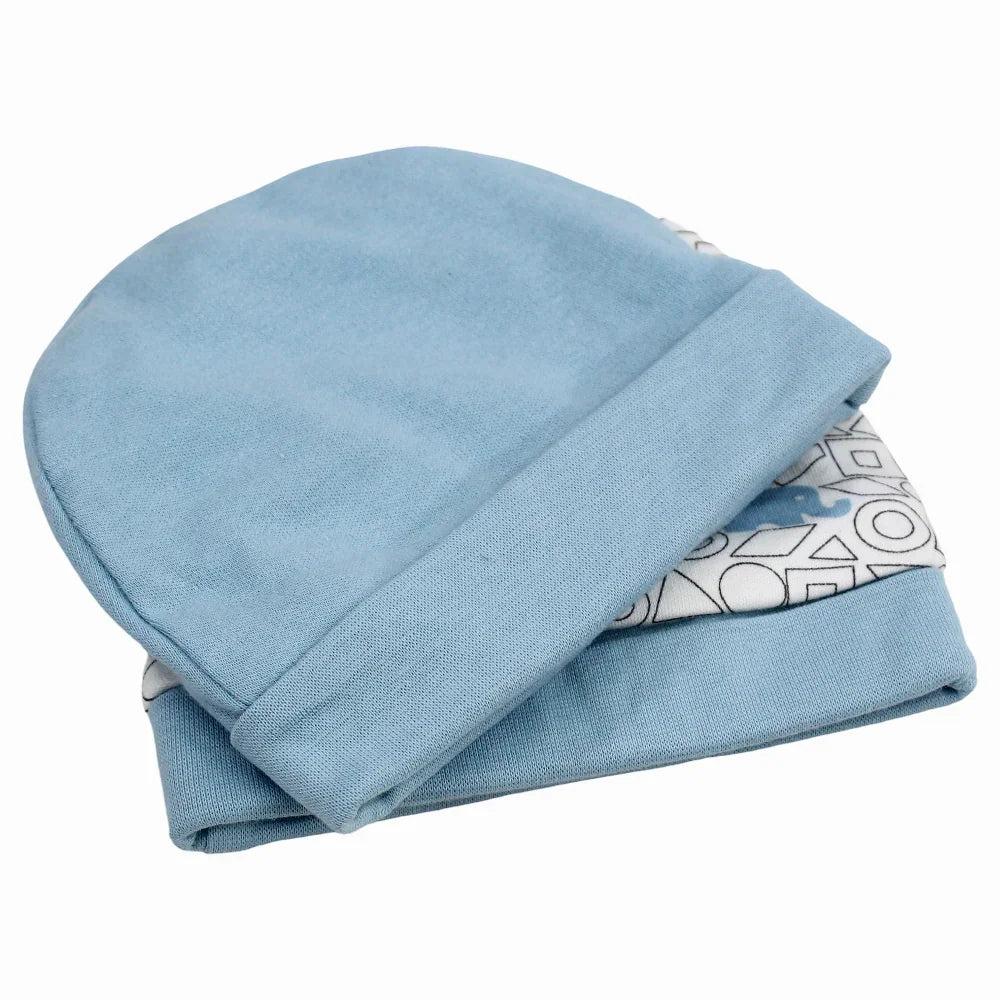 Baby Boys Cotton Beanie - Blue & Off-white with a Cute Print (2Pcs)