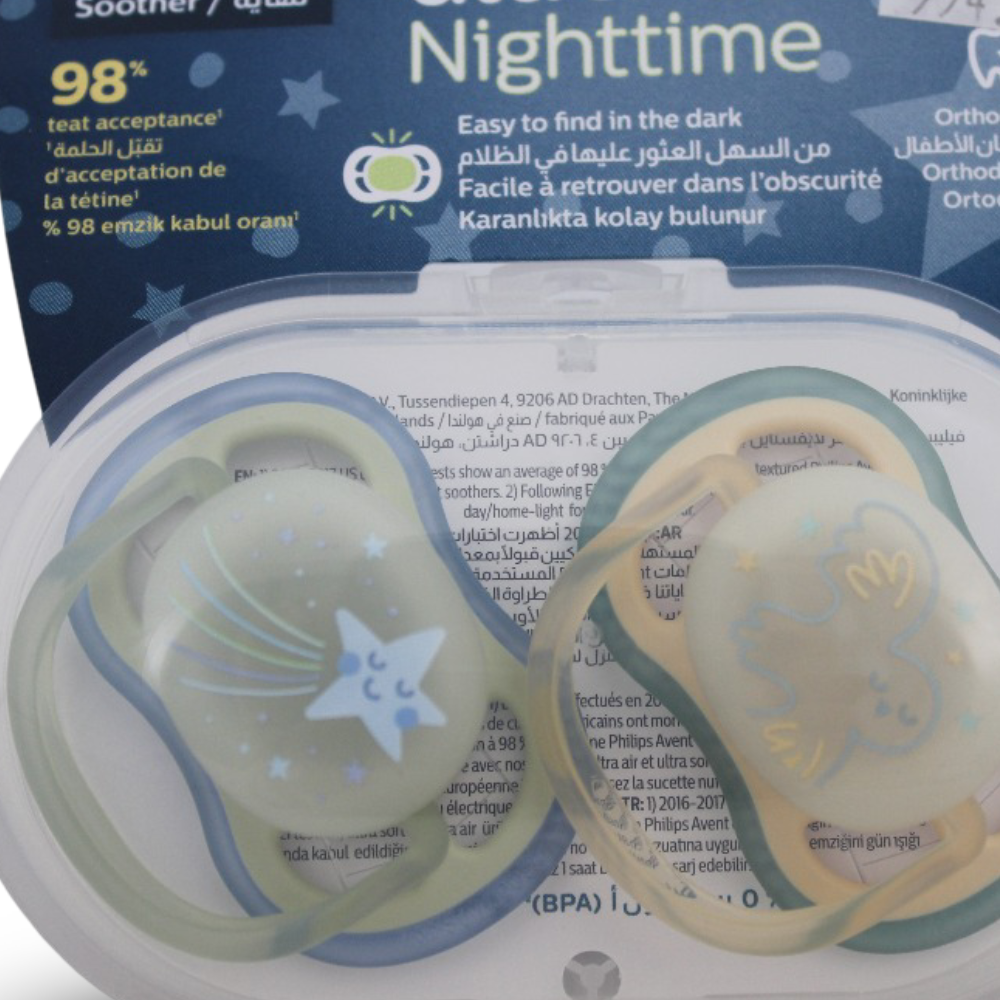 A Philips Avent Ultra Air nighttime pacifier designed to provide comfort and promote peaceful sleep for babies.