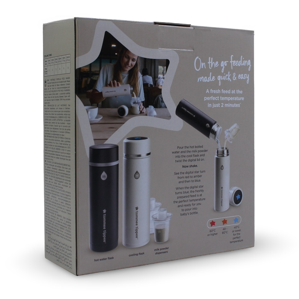 The Tommee Tippee GoPrep Portable Formula Feed Maker Set is the perfect travel companion for parents who need to prepare baby feeds quickly, safely, and on the go. This smart system helps you make a fresh bottle at the right temperature in just two minutes — no waiting, no fuss.