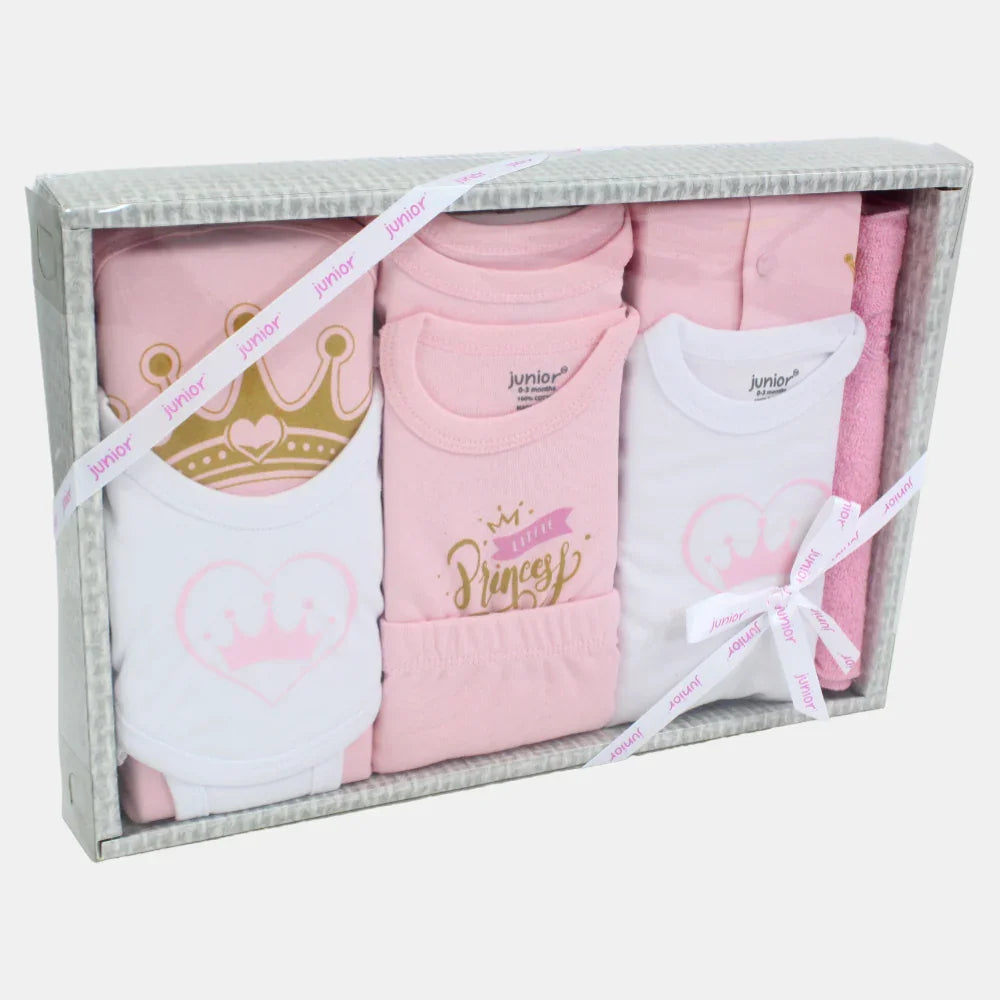 This adorable 10-piece gift clothes box for baby girls is designed with a princess theme in soft pink. It's a delightful and practical gift for any little one, offering a complete collection of essential clothing items.