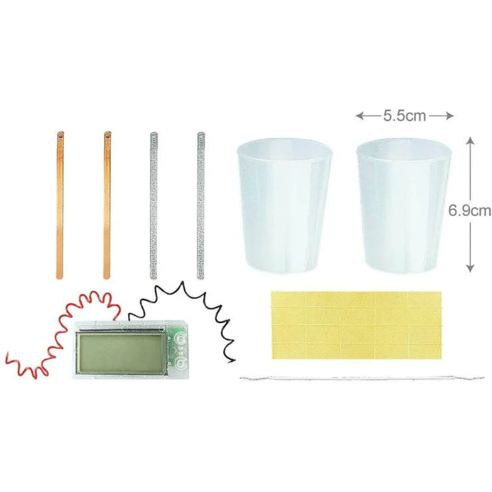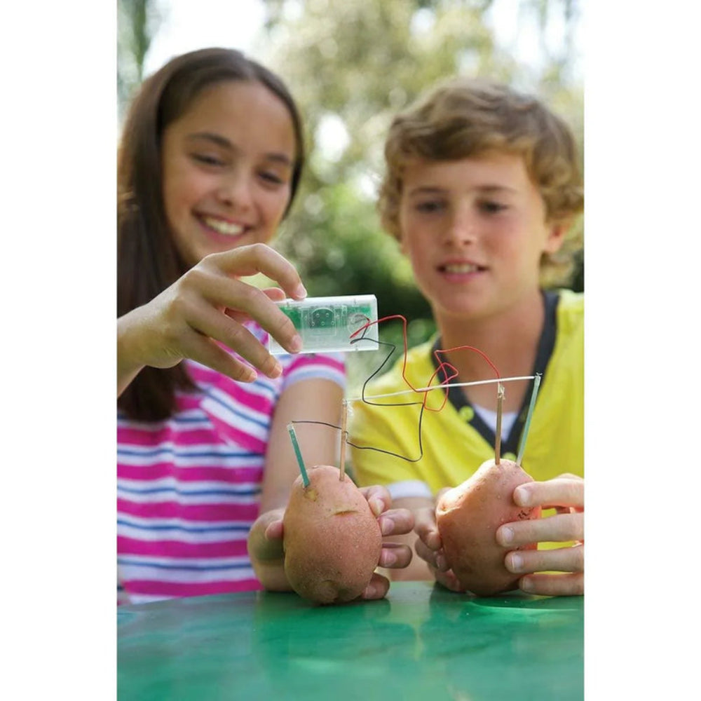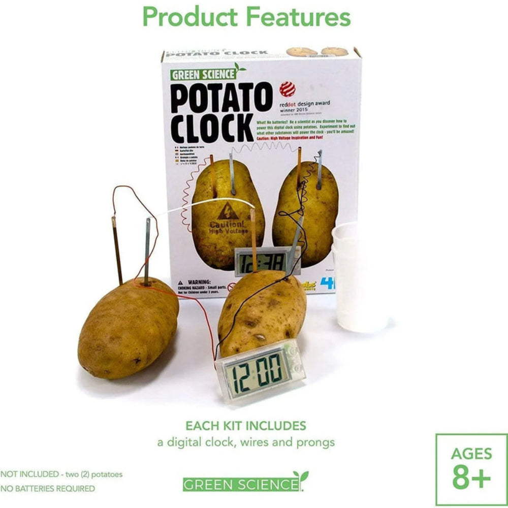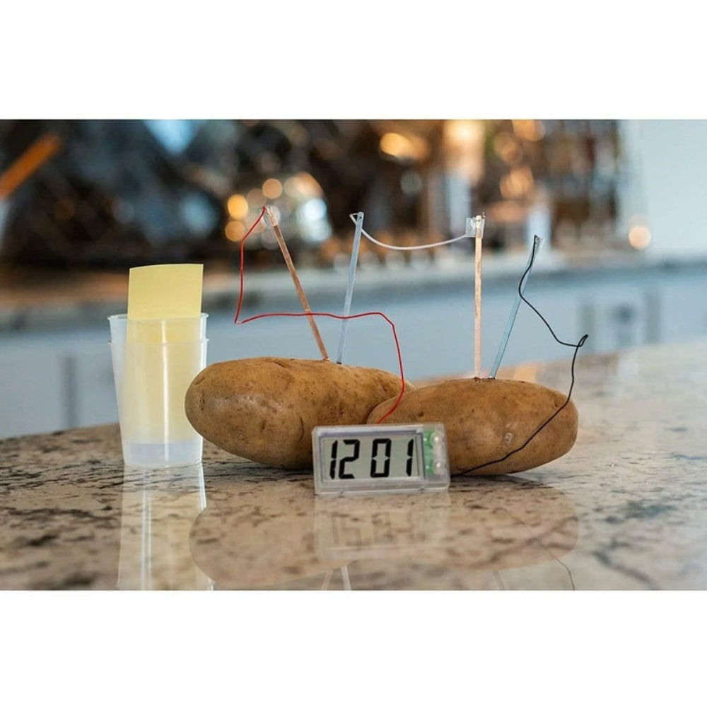ساعة البطاطس. تعلم كيفية استخدام البطاطس لتشغيل ساعة رقمية ، دون الحاجة إلى بطاريات. تتضمن المجموعة ساعة رقمية بأسلاك وأواني وأسلاك توصيل وشرائط نحاسية وزنك وتعليمات مفصلة.