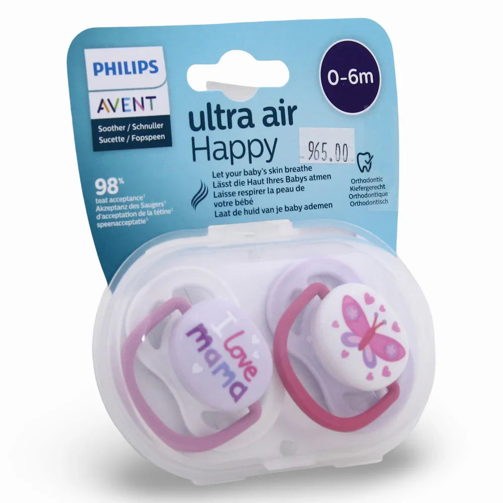 هدّئي طفلك بلهاية تسمح لبشرته بالتنفس. تحتوي مجموعة Philips Avent ultra air على فتحات كبيرة جدًا للحفاظ على جفاف الجلد. تم تصميم درعها خفيف الوزن لتحقيق أقصى تدفق للهواء. متوفر بألوان وتصميمات مختلفة.
