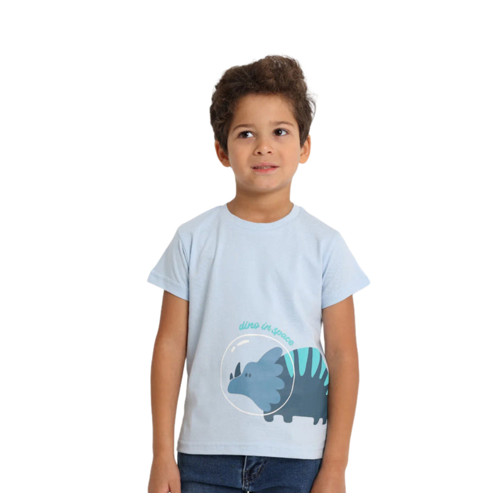 This adorable Babyblue T-shirt features a fun "Dino in Space" graphic, perfect for young adventurers. Made from soft cotton, it ensures all-day comfort and a playful look for your little one.
