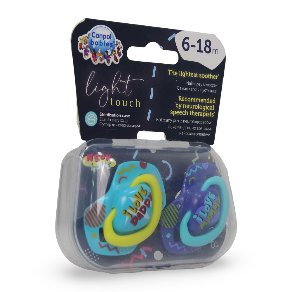 Canpol Babies Silicone Soothers Light Touch Symmetrical Neon Love designed to comfort older babies with a lightweight, gentle feel and easy acceptance.