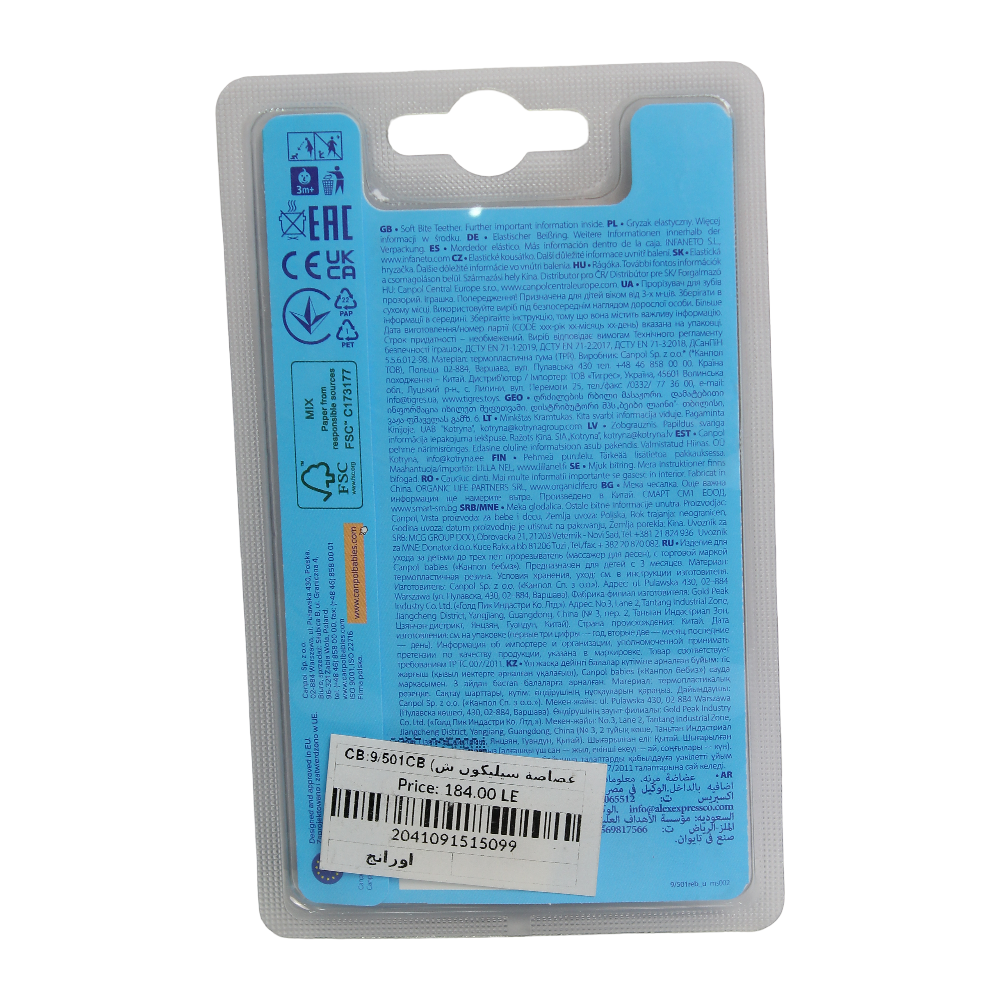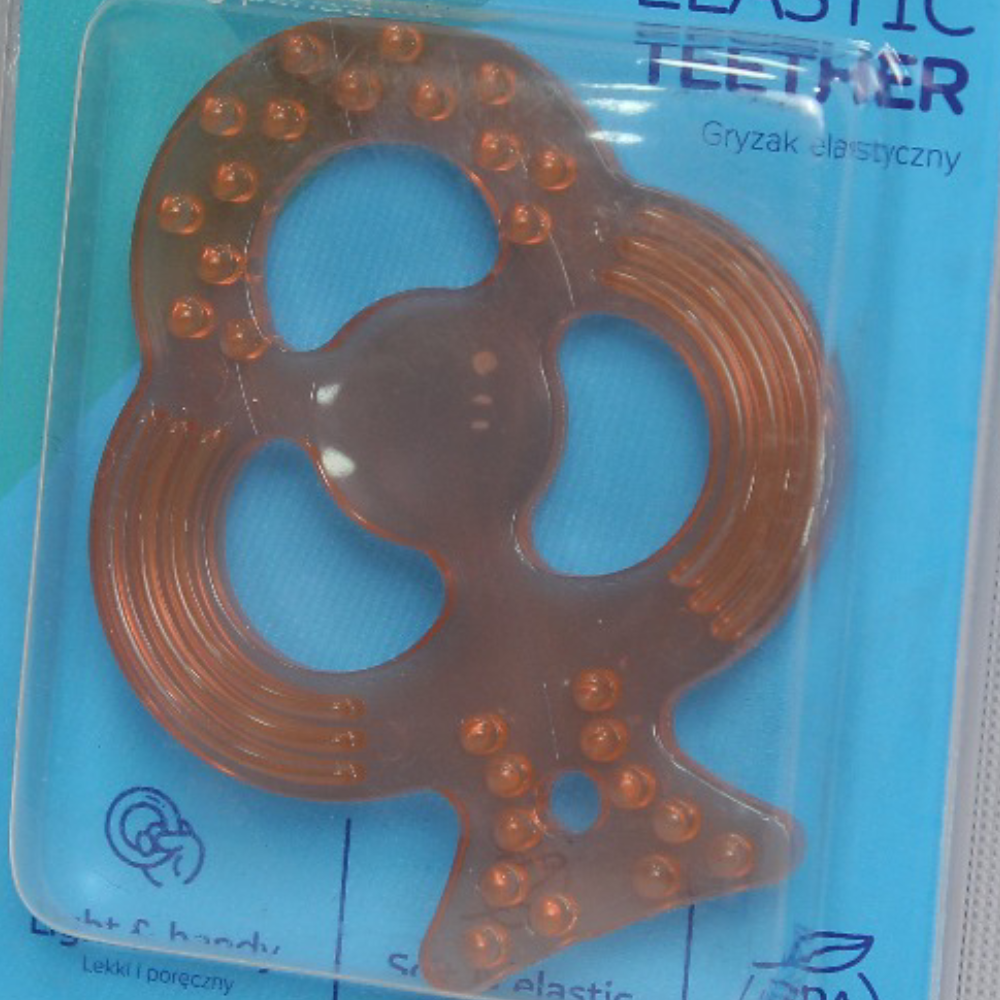 Elastic teether designed to soothe babies’ gums during teething while providing a safe and engaging chewable toy.