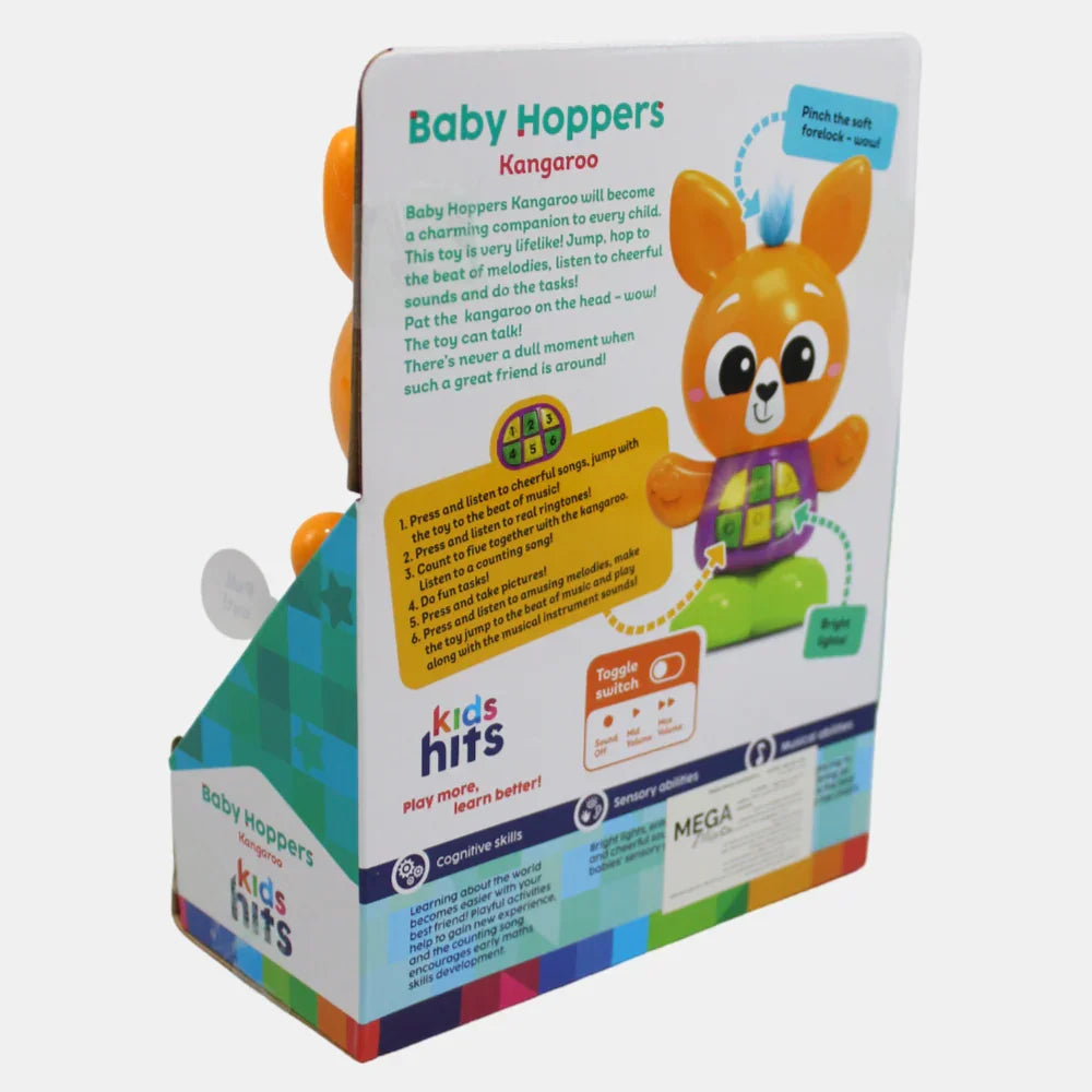 Bring joy, music, and learning together with the adorable Kids Hits Baby Hoppers Kangaroo. This interactive kangaroo is full of surprises — from light-up buttons and cheerful sounds to dancing, counting, and singing along. With every jump, laugh, and song, children explore their creativity while developing essential skills in a playful and engaging way.