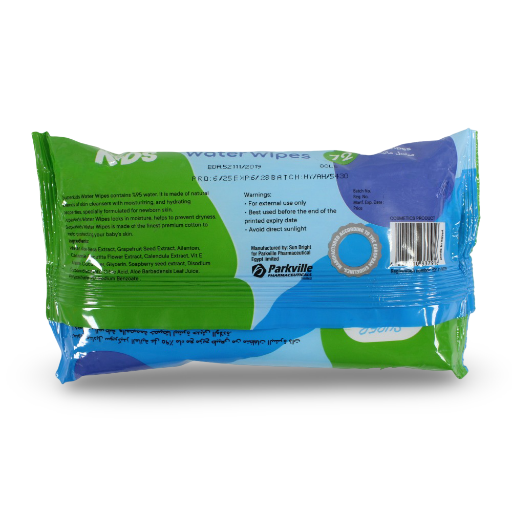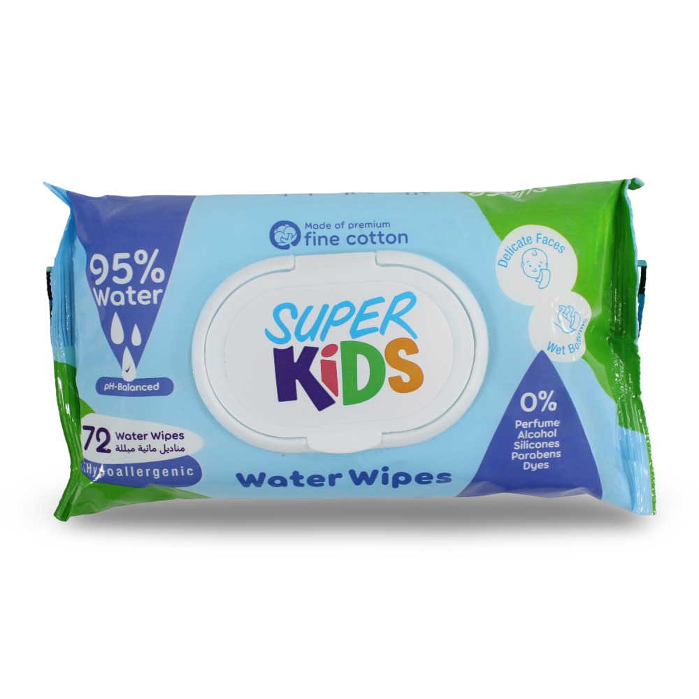 تحتوي مناديل سوبر كيدز المائية على 95% من الماء. مصنوع من مزيج طبيعي من منظفات البشرة ذات خصائص مرطبة ومرطبة، مصمم خصيصًا لبشرة الأطفال حديثي الولادة.