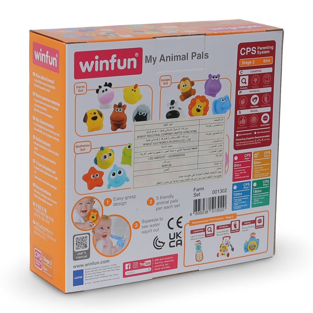 أضف المرح لوقت استحمام طفلك مع طقم فارم بالز. يأتي مع 5 حيوانات: كلب وبقرة ودجاجة وحصان وخروف. تأكد من ترفيه طفلك أثناء الاستحمام أو السباحة. مناسب للأعمار من 6 شهور فما فوق.