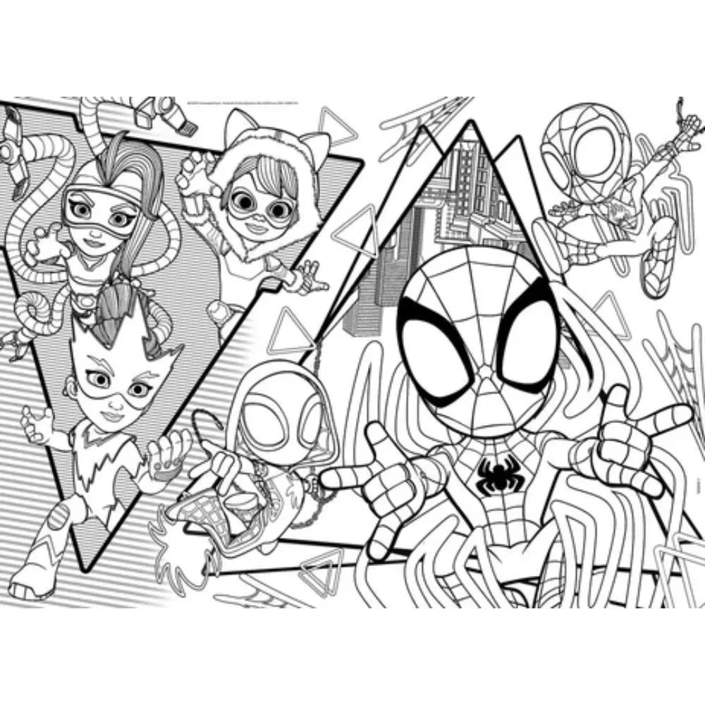 • Double-face puzzle → assemble a colorful Spidey scene, then flip it to color the black-and-white version on the back