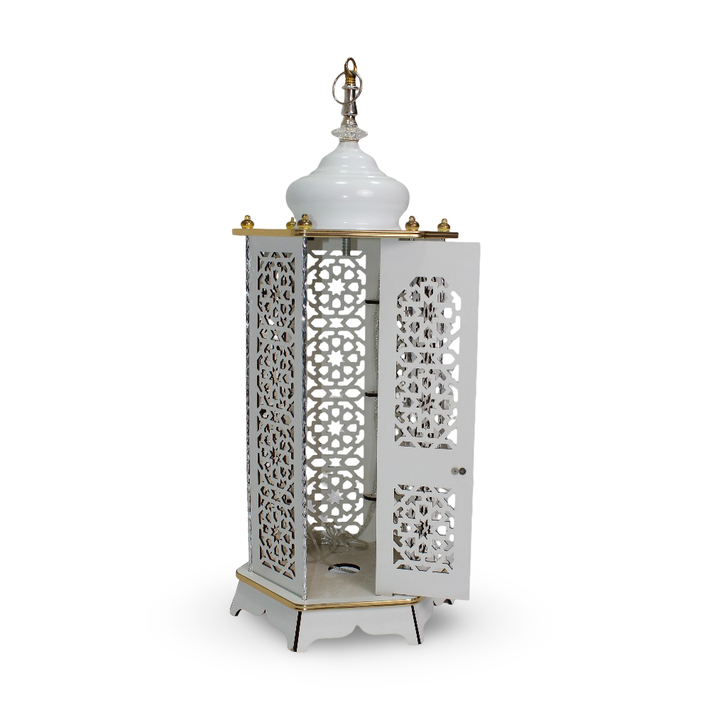 A stunning white Arabesque-patterned LED Ramadan lantern (70 cm) designed to add an elegant and illuminated touch to your home décor throughout the holy month.