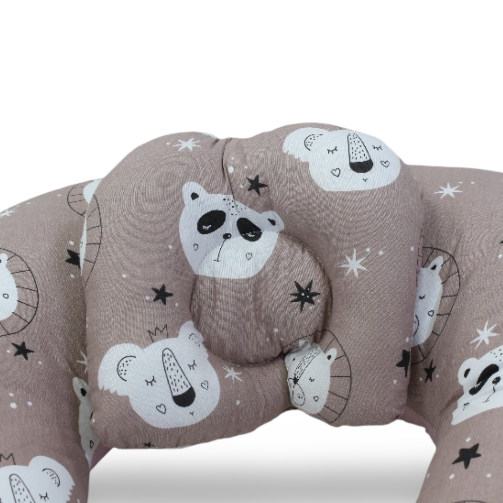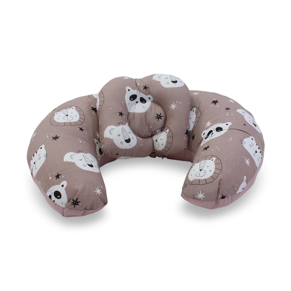 A dusty pink nursing pillow with animal print, designed to provide support and comfort for both baby and parent during feeding time.