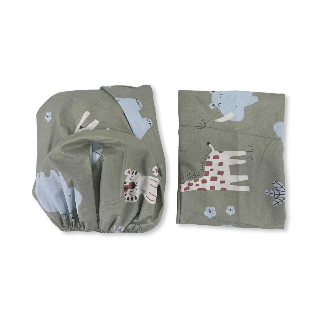 A soft and breathable cotton bed sheet featuring a fun animals print, perfect for cozy and cheerful bedroom styling.