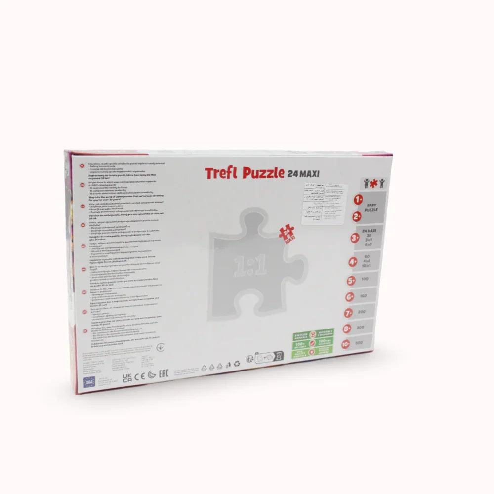 24 maxi puzzle consisting of 24 very large pieces, designed for all Pony fans. After completing the puzzle, a large picture will be created, measuring 600x400mm. The product is made of high-quality materials, using special calendered paper that reflects light, which makes it easier to arrange. The product was produced in Poland and ecological materials were used for production.