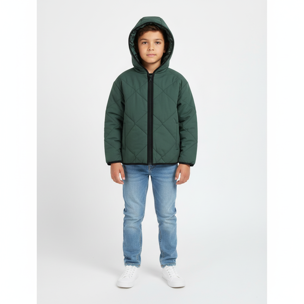 Boys Waterproof Double Face Jacket – Dark Green with Dino Print