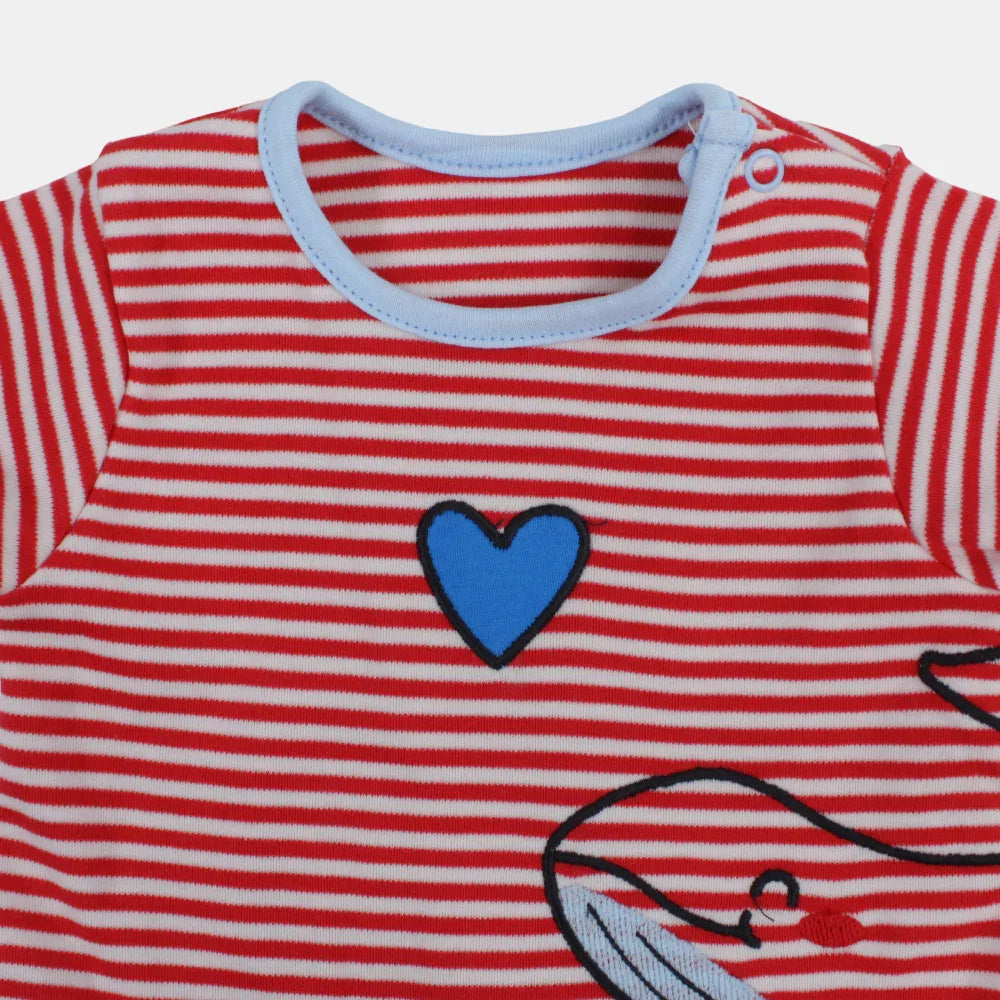 Unisex Baby Cotton Romper – Red Striped with Shark Design