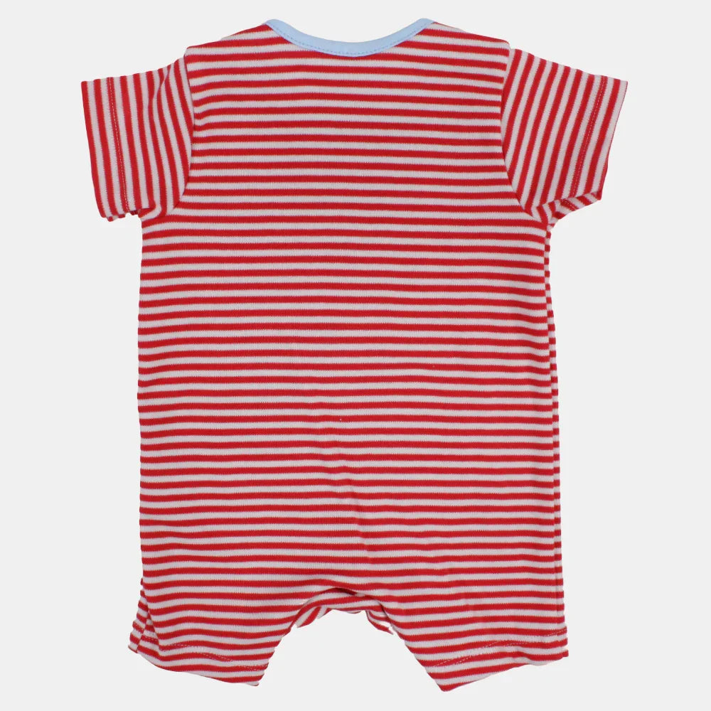 Brighten your little one’s day with this cheerful red striped romper, designed for comfort and playful style.