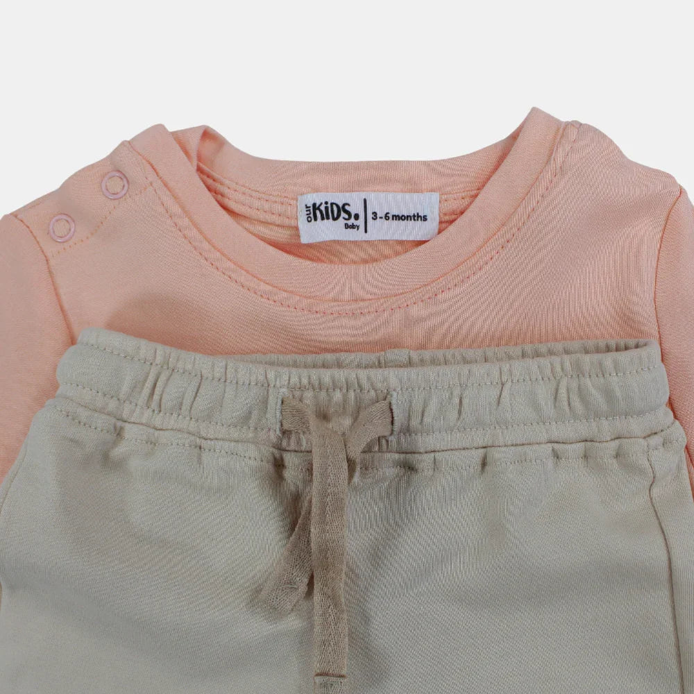 Soft and breathable, this salmon-colored pajama set features a playful love robots design, perfect for cozy nights.
