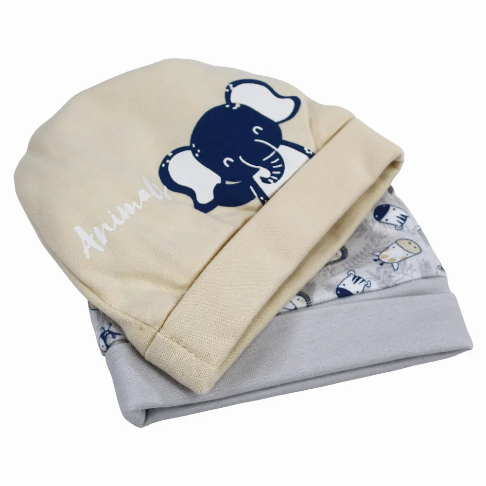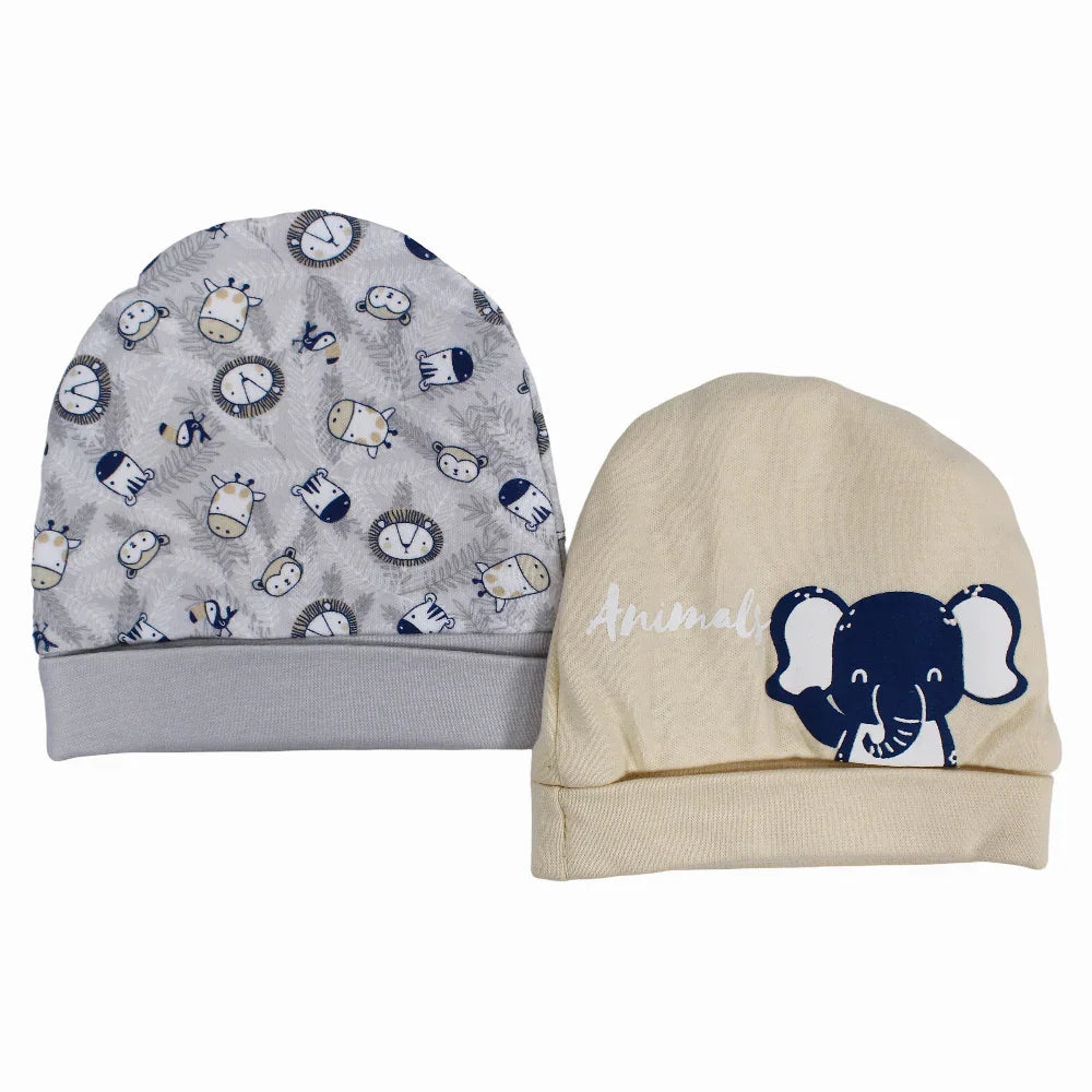 Baby Boys Cotton Beanie – Beige & Grey with Animal Design (2Pcs)