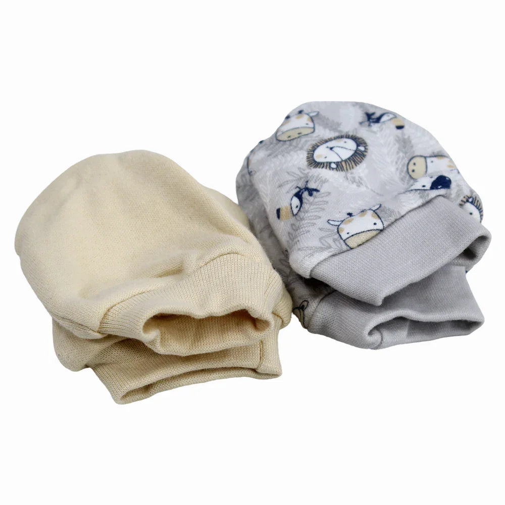 Baby Boys Cotton Hand Mittens – Beige & Grey with Animal Design (2Pcs)