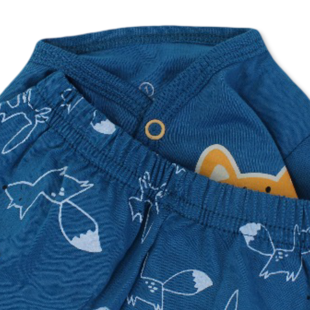 • Blue with fox & hedgehog print → playful and charming bedtime look