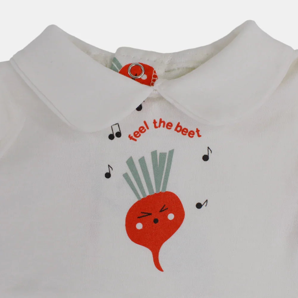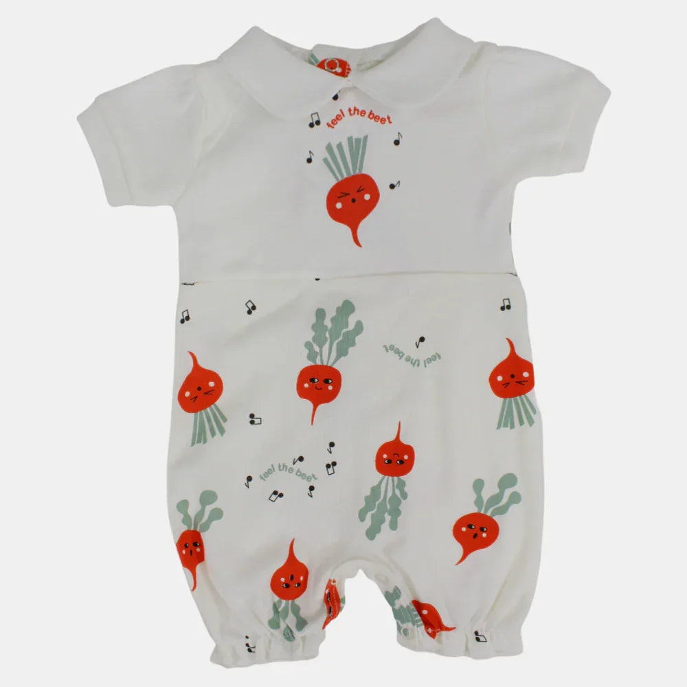 A cute and comfy romper designed for little girls, featuring a fun "Feel the Beet" print that adds a playful touch. Made from 100% soft cotton, this romper is perfect for keeping your baby cool and comfortable throughout the day.