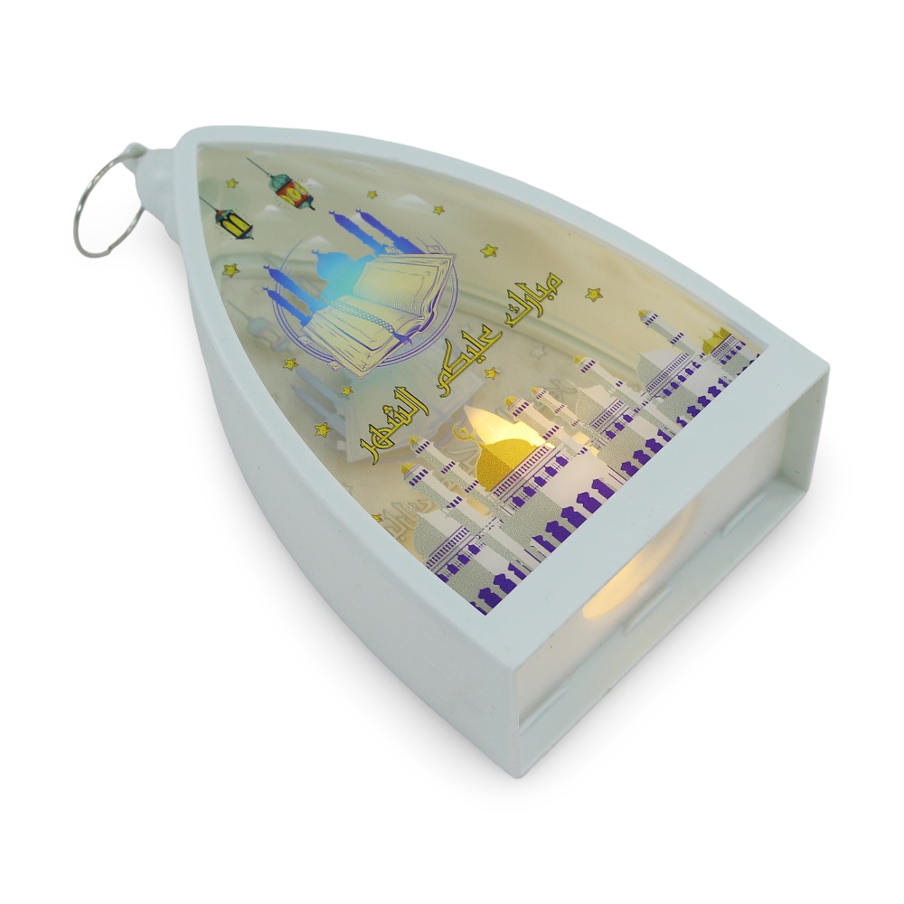 A sleek white acrylic lantern with a candle, designed to add a soft, warm glow and festive charm to your Ramadan celebrations.
