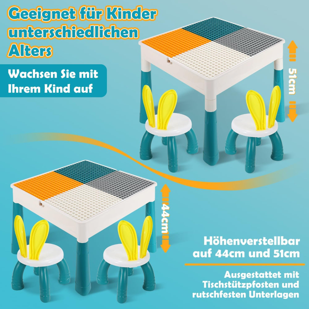 Inspire creativity and learning with the Large Building Table featuring 4 storage compartments, 4 adjustable height levels, and an adorable rabbit chair! This complete 220-piece building block set provides endless fun for children to build, play, and explore their imagination.