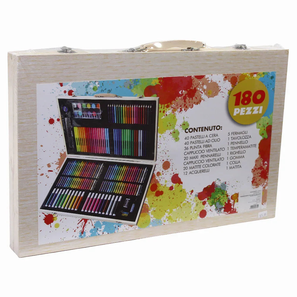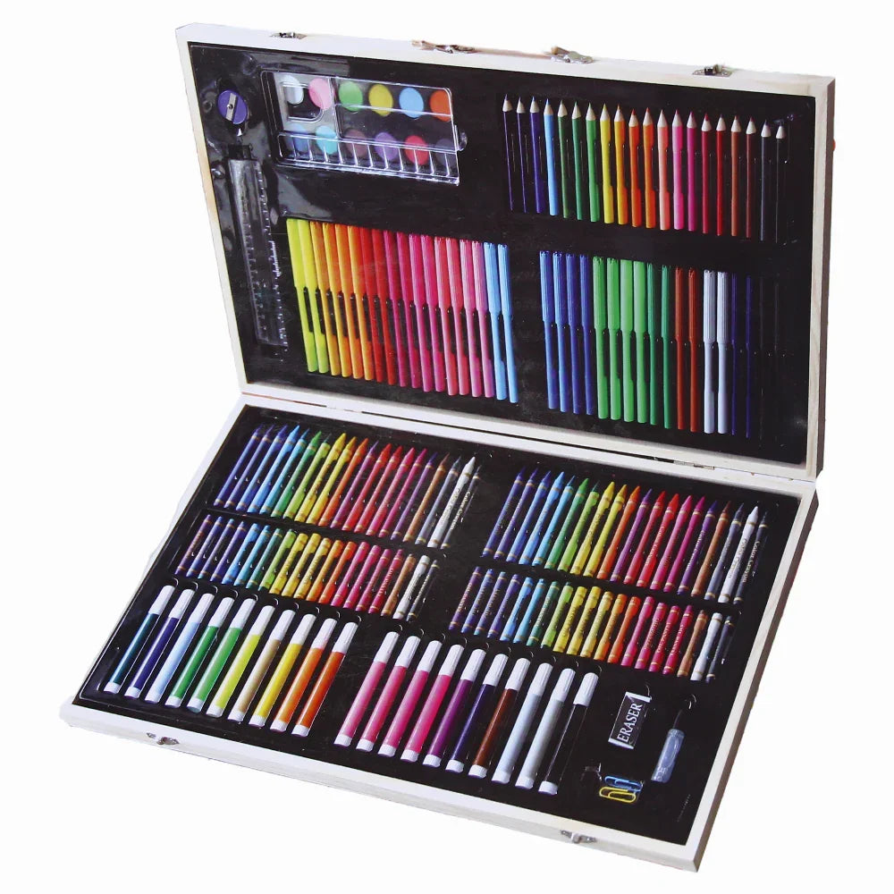 Includes 180 art supplies such as colored pencils, markers, crayons, paints, brushes, and more
