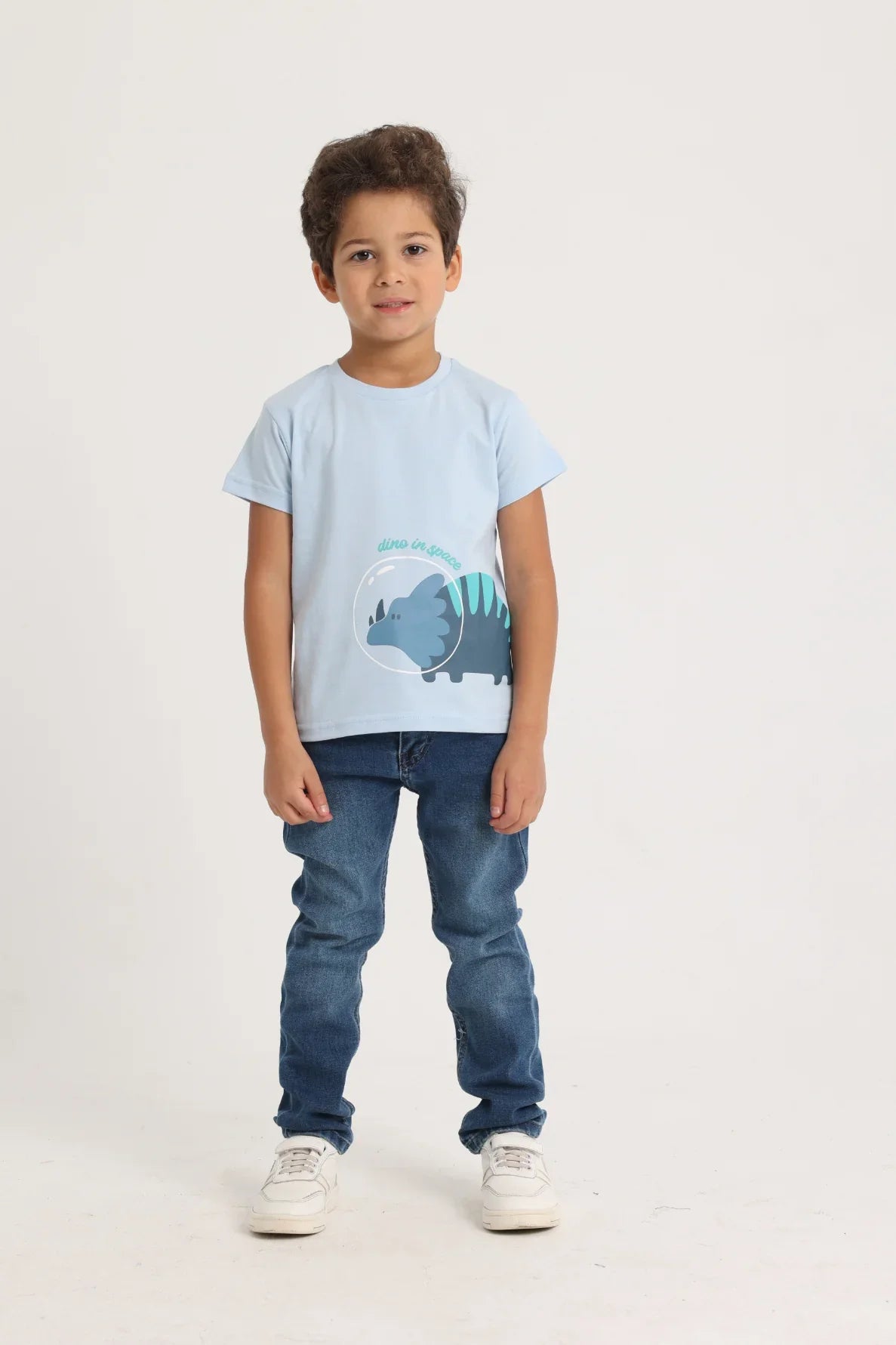 This adorable Babyblue T-shirt features a fun "Dino in Space" graphic, perfect for young adventurers. Made from soft cotton, it ensures all-day comfort and a playful look for your little one.