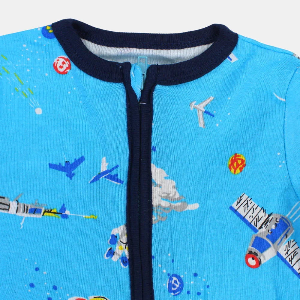 Baby Boys Cotton Romper – Turquoise with Space Print and Zipper Detail