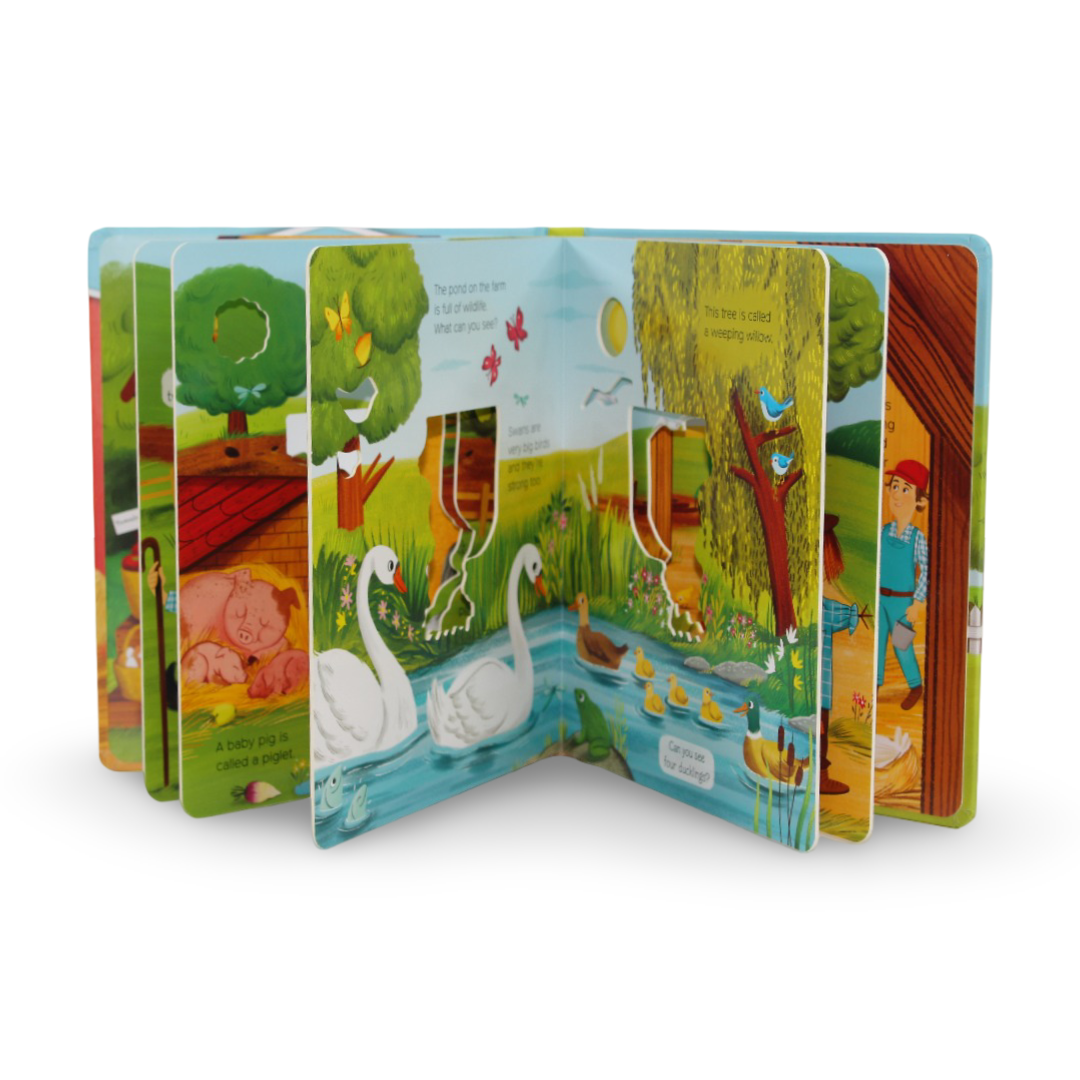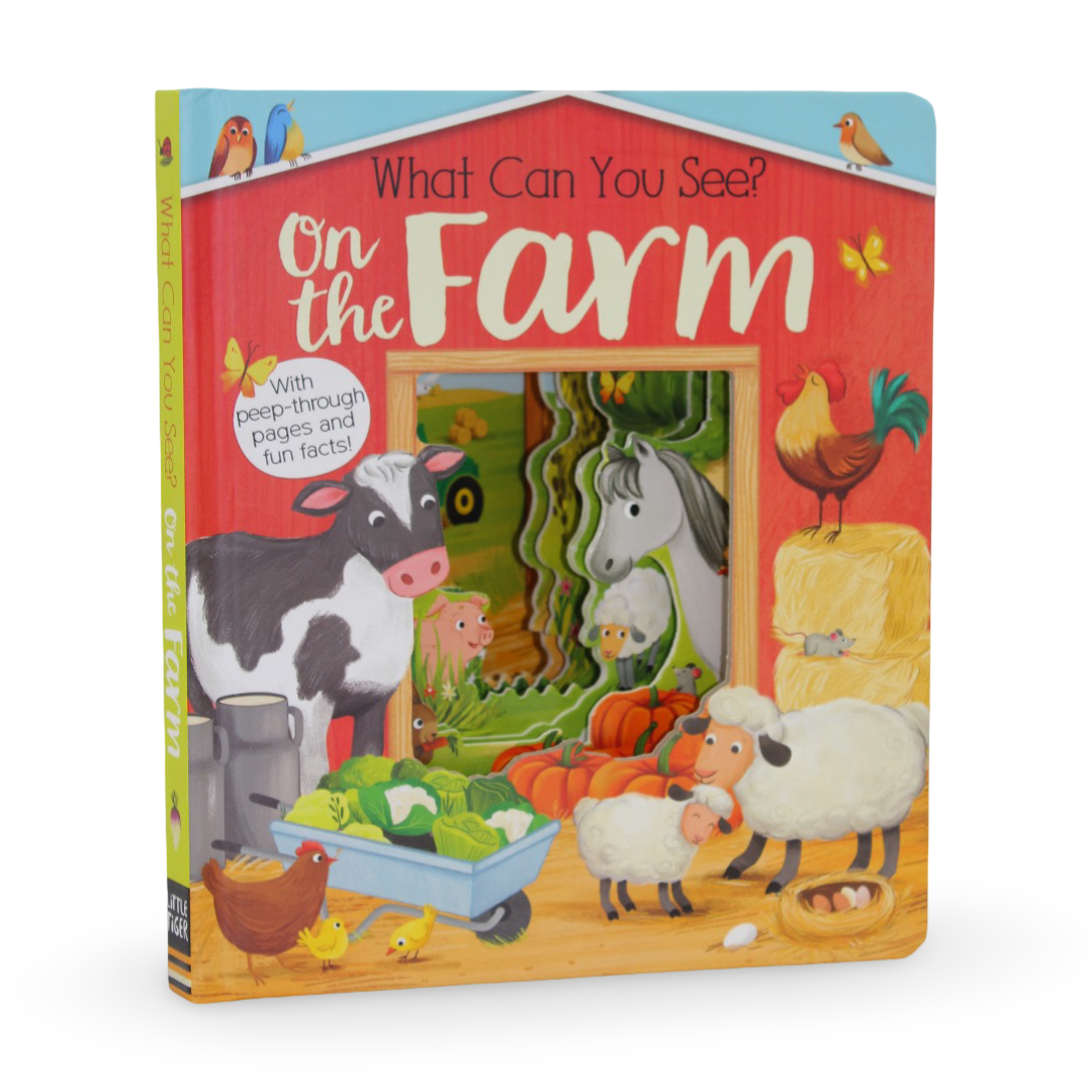 An interactive picture book that invites young children to explore farm life by spotting familiar animals, objects, and scenes.