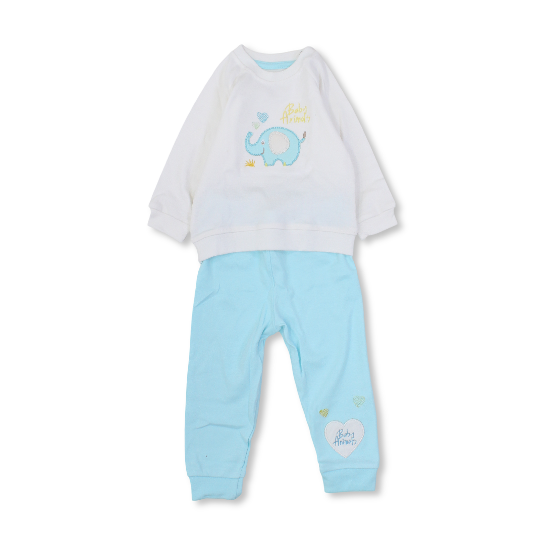Unisex Baby Cotton Pajama Set – Off-White/Aqua with Elephant Design