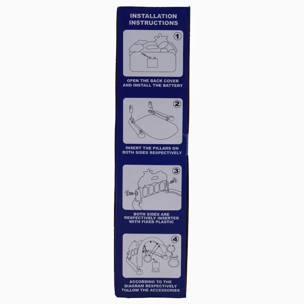 Soft pink giraffe theme invites playful kicks and musical exploration.